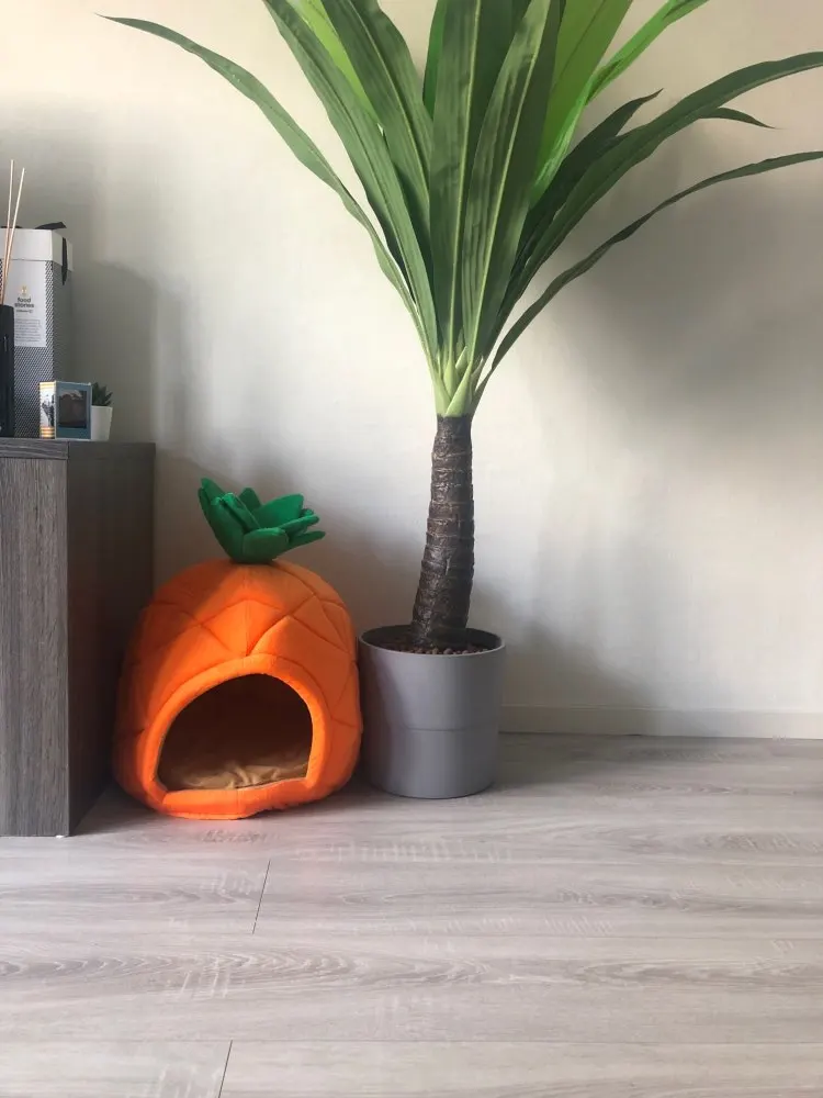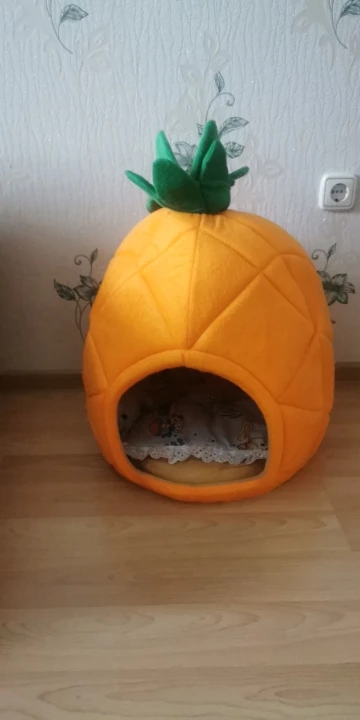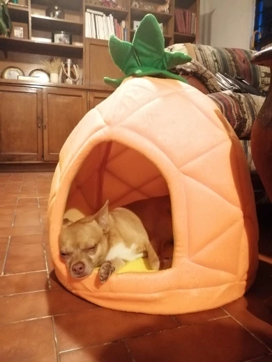 Give your pet a cozy spot to rest their paws with the Pineapple Bed. The super-soft plush fabric and enclosed tent shape make this pet bed the perfect hideaway. Puppies will enjoy having a den-like home to curl up in, and kitties can settle in for quiet naps. With a removable cushioned pillow, the Pineapple  Bed is a comfortable retreat that you can set up at home or take along with you on trips. It’s machine washable for easy cleaning, and comes in a tropical orange color that will accent your home décor. This bed is available in three sizes to fit puppies and cats of all sizes.